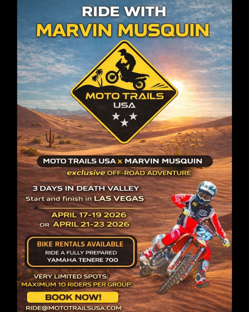 Moto Trails USA announced a unique three-day off-road experience in partnership with former factory Supercross, motocross and GP racer Marvin Musquin.