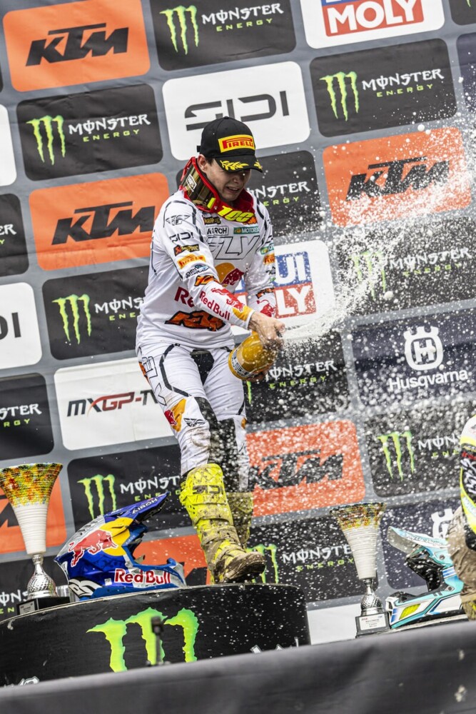 Sacha Coenen dominated the MX2 division with his best ride of the year. The Factory Red Bull KTM rider won the Saturday Qualifying Race and later claimed both holeshots and both moto victories on Sunday’s overall sweep. Even with a crash in race two, the young Belgian rider still took the top spot and scored massive ground in the championship. With his fifth Grand Prix victory of his career, he’s now just three points down from KTM teammate Simon Laengenfelder.