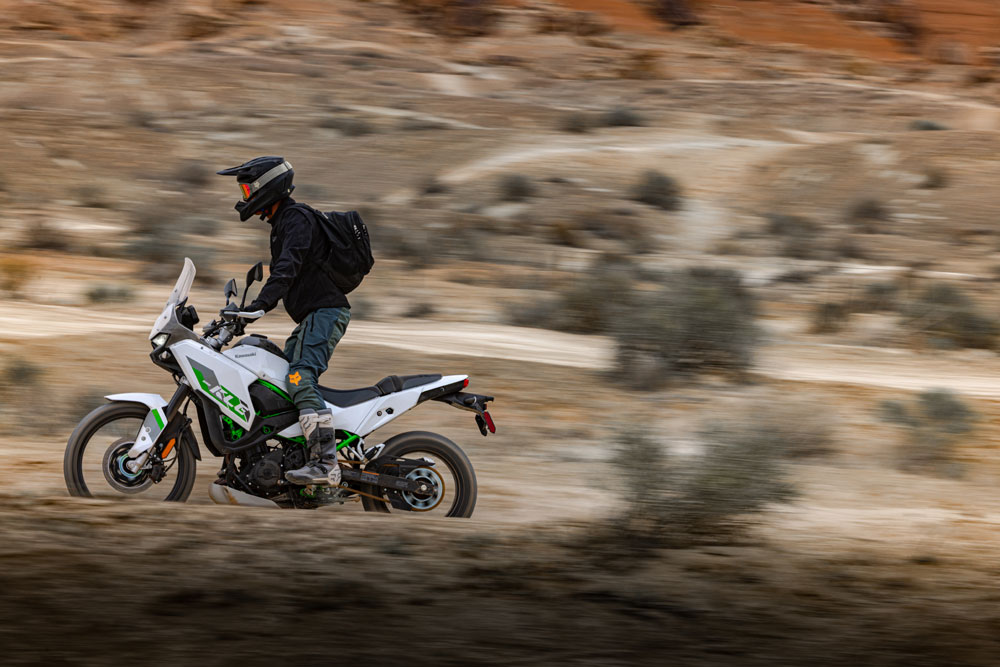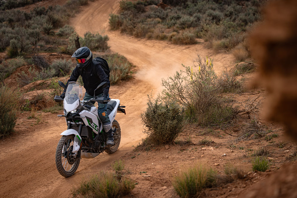 I’ll get right to the good stuff first. Comfort. I’m assuming Kawasaki engineers figured out the perfect rider position for long-distance on- and off-road riding and then designed the KLE500 around that. At least for my 6-foot-1 frame, the KLE500’s ergonomics are spot on, especially the footpegs, which sit right under you, the handlebars, which are positioned where they should be, and the seat, which is comfortable in both shape and texture. It’s also narrow between your legs and very smooth, with no bulges or edges to snag your gear. Plus, seat height is not an issue for me; I could easily plant both feet on the ground. I appreciated all this on my first day on the bike. Kawasaki introduced the KLE500 to the media in Southern Utah, where we spent the day riding the SE model on a mix of pavement and dirt, covering 150 miles in pretty much one shot.