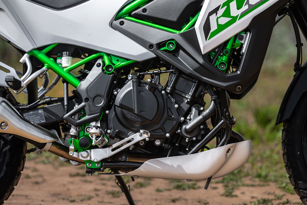 The heart of the KLE500 is its 451cc parallel-twin engine, the same engine that powers Kawasaki’s Ninja 500, Z500 and Eliminator street models, with very few changes for its new adventure application. Most of the engine modifications from the street side to its new adventure role involve mostly how it breathes, via a larger airbox and an updated downdraft intake system. The KLE also uses an updated 46T/15T final drive ratio.