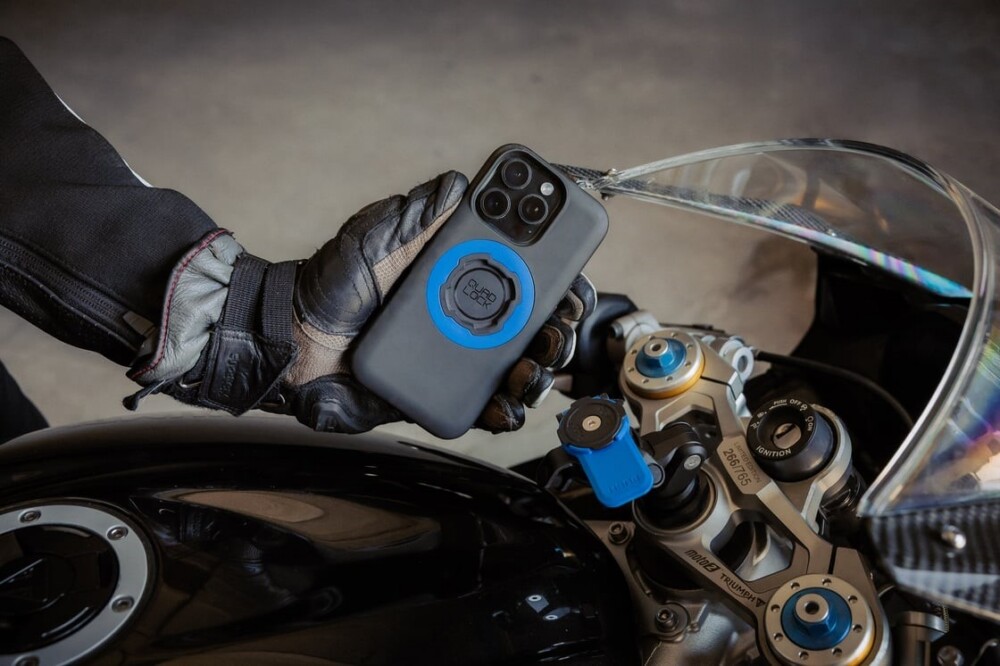 While you won’t find a smartphone on a Superbike’s triple clamp, Quad Lock’s ultra-secure steering stem mount would be more than capable of handling the job. Photo courtesy of Quad Lock.