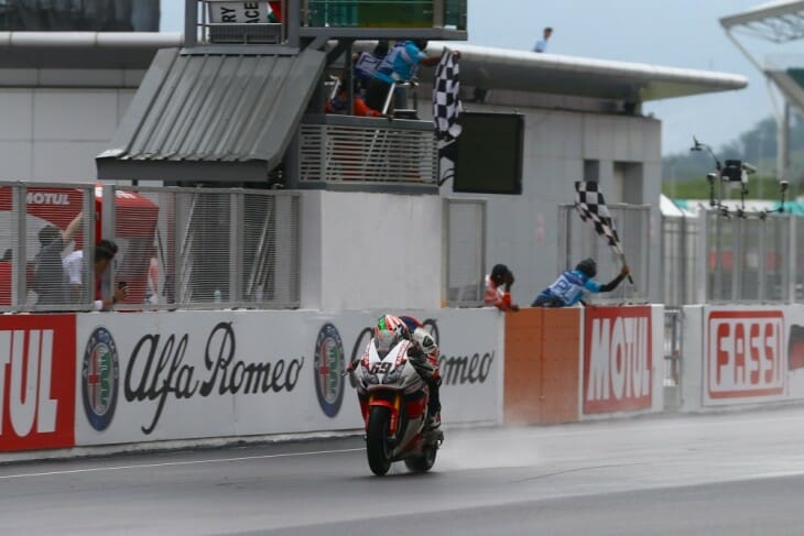 Stand-in rider Ayrton Badovini takes the win in atrocious conditions.