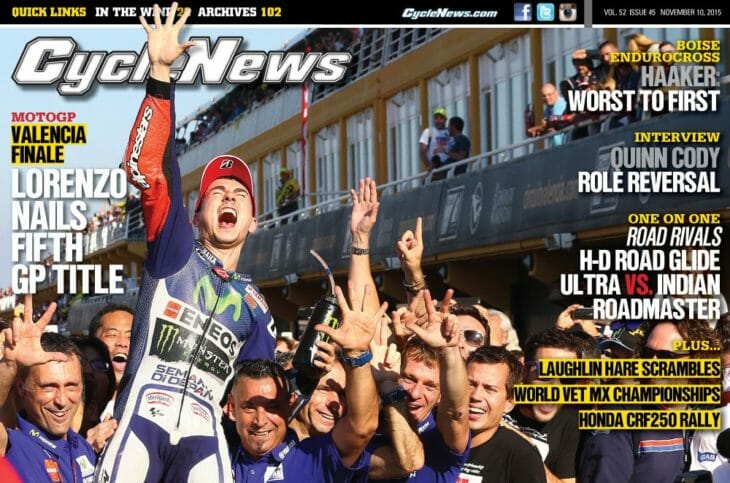 Jorge Lorenzo survived all of the commotion on and off the track to claim his fifth grand prix world championship of his career at the season finale at Valencia. CLICK HERE to read the issue